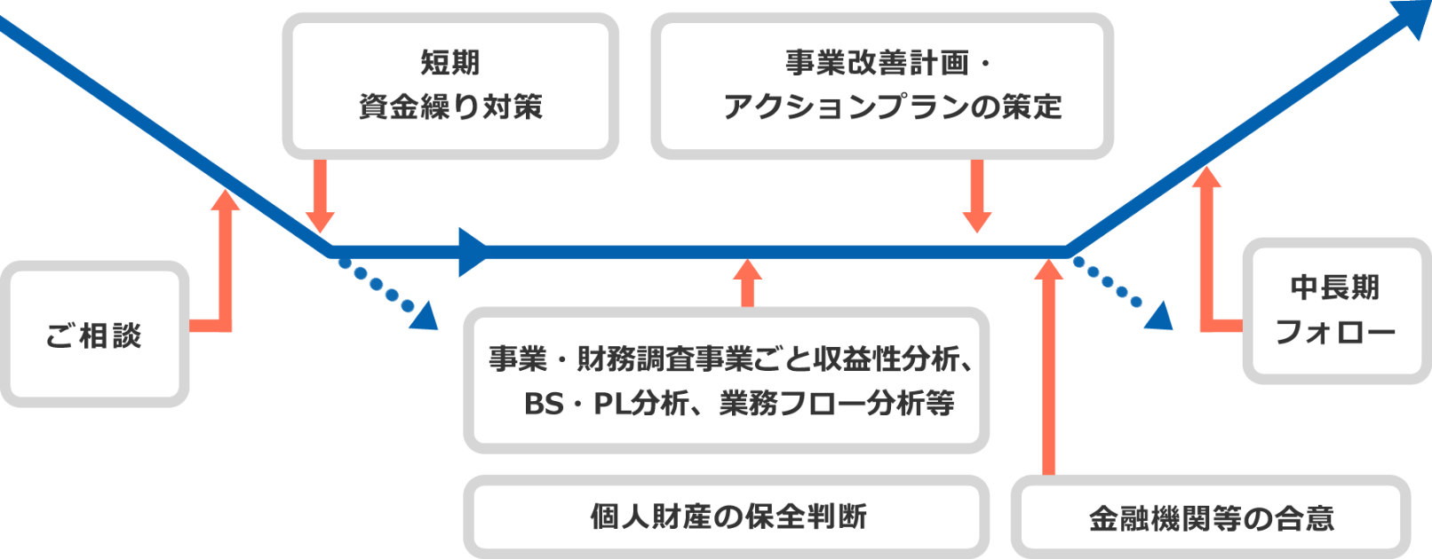 策定したアクションプランの実施を継続的にフォロー。金融機関への報告支援や実績検証を通じて、経営の立て直しと再発防止をサポートします。