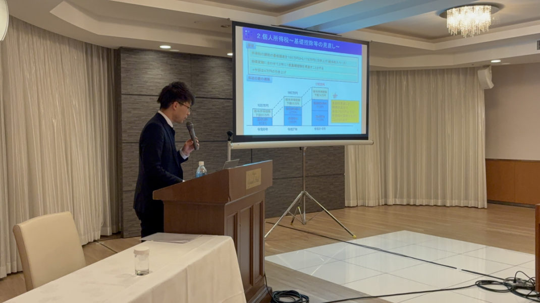 今回の研修会では、弊所の社員税理士である若月が講師を担当いたしました。関与先の皆様にとって特に影響の大きい改正点や、基礎控除などの共通事項に焦点を当て、実務に即した解説を行いました。